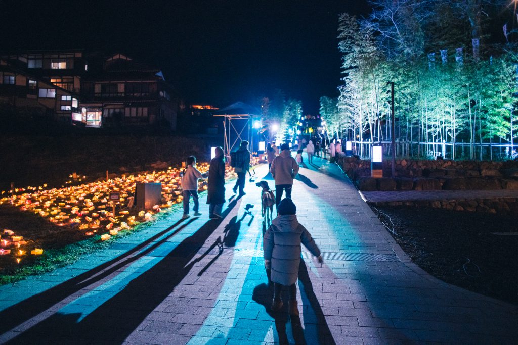 また、こちらの場所は冬のライトアップイベント「音信川うたあかり」の中心スポットとなり、童謡詩人金子みすゞの詩と共に、 色とりどりの光に照らされた幻想的な景色を見ることができます。
