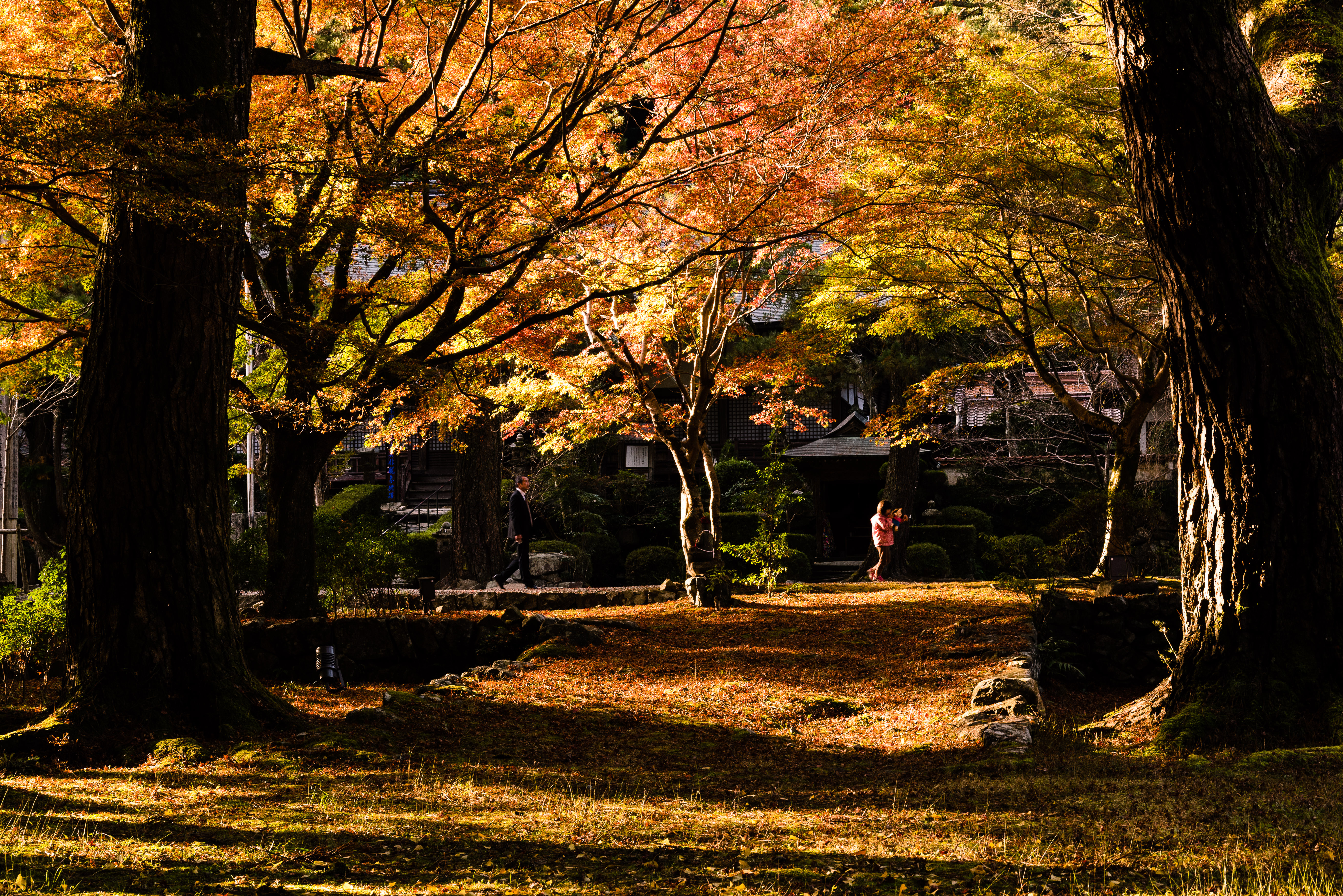 늦가을의 불타는 단풍의 광경을 잘 파악하고 있다. 쏟아지는 빛 속에 작은 아이를 배치함으로써 단풍의 훌륭함 경내의 넓이를 느끼게 해, 인상 깊은 사진이 되고 있다.