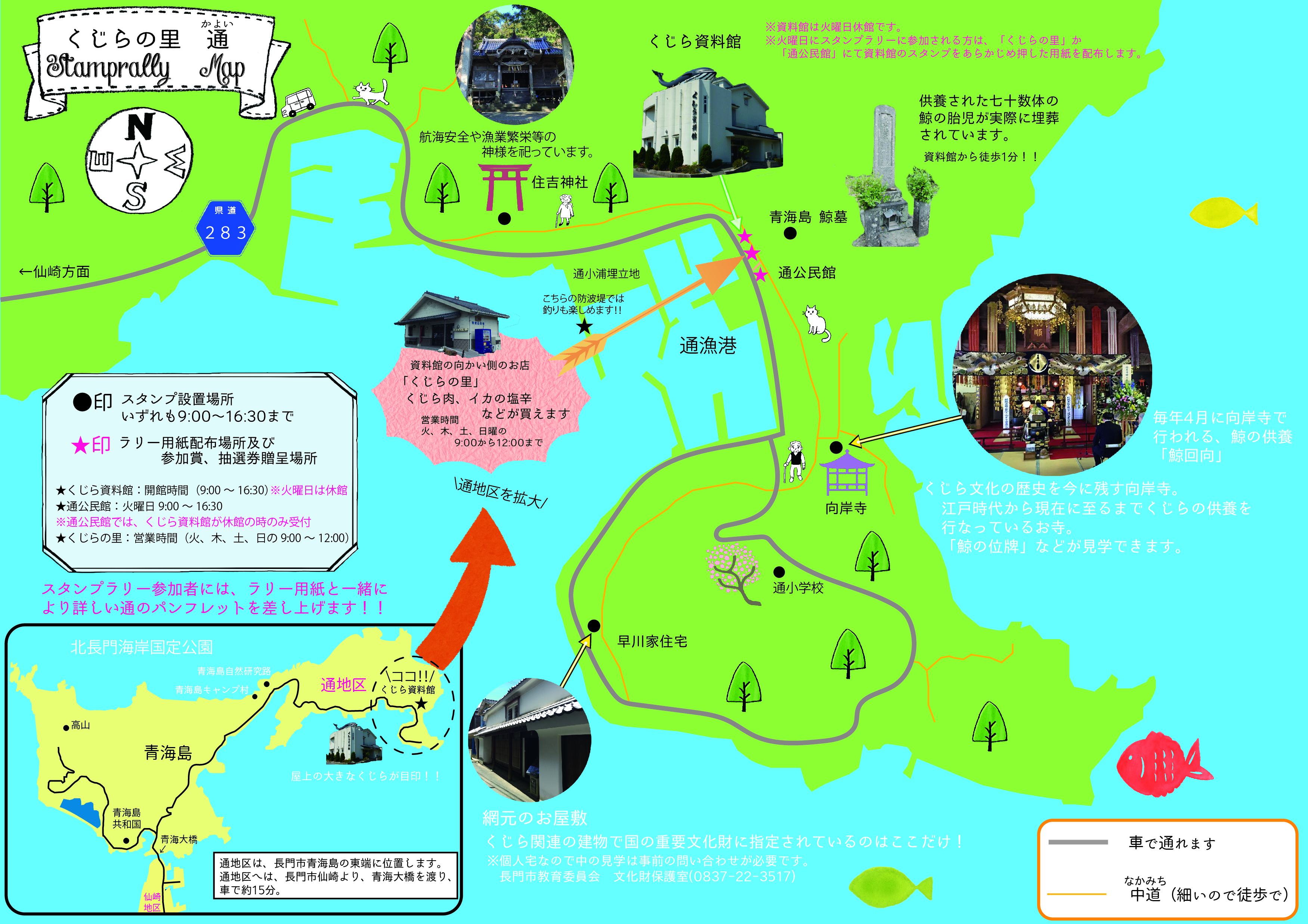 통지역 오코시 협력대의 마키(마키)씨발안의 “제1회 구지라의 마을 스탬프 랠리”를 소개하겠습니다. 통지구에서 지역 일어나 협력대로서 1년 반 보내 온 마호씨는, 통지구의 옛날 그대로의 풍정 있는 거리 풍경을, 여러분에게 걸어, 느껴 주었으면 한다는 생각으로 이 이벤트를 발안되었다고 합니다. 오는 봄의 방문을, 옛날의 어부읍·도리 지구를 실제로 걸어 느껴 보지 않겠습니까? 멋진 참가상이나 추첨은 됩니다만, 도츠구의 특산품이 맞는 기회도 있다고 해요. ●이벤트 상세 ■개최 기간 2016년 3월 5일(토)~3월 31일(목) 9:00~16:30 ■스탬프 대지 배포 장소 ①쿠지라 자료관 9:00~16:30 9:00~12:00 ※영업일:화・목・토・일요일 ■스탬프 설치 장소・쿠지라 자료관・아오미지마 고래묘・스미요시 신사・무카이시지・하야카와가 주택 총 5개소 모두 설치 시간은 9:00~16:30 ■참가상・추첨상품 랠리 참가자로, 스탬프를 3개 이상 모은 사람에게는, 참가상으로서 「오리지널 우표 52엔분」을 1장, 스탬프를 5개 모은 사람에게는 「오리지날 우표 52엔분・82엔분」을 1장씩 선물합니다. 또, 3개 이상의 스탬프를 모으면, 「통의 특산품 1만엔분(치리멘, 건어물, 고래 고기 등)」이나 「고래의 마을 세트 3천엔분」등이 맞는 「추첨권」을 증정합니다 또한, 추첨은 한 분 1회 한정입니다. ↓오리지날 우표 디자인(상·52엔, 아래·82엔) ■문의처 통통 공민관 내 지역 행사 협력 대원 통 지구 담당 마야(마키) TEL0837-28-0008 ■관련 링크 나가토시 지역 부흥 협력대 facebook 페이지 https://www.facebook.com/nagatoshi.kyouryokutai/ 쿠지라 자료관 p/attractions/kujira 고래묘 http://nanavi.jp/attractions/kujirabaka 하야카와가 주택 http://nanavi.jp/attractions/hayakawake