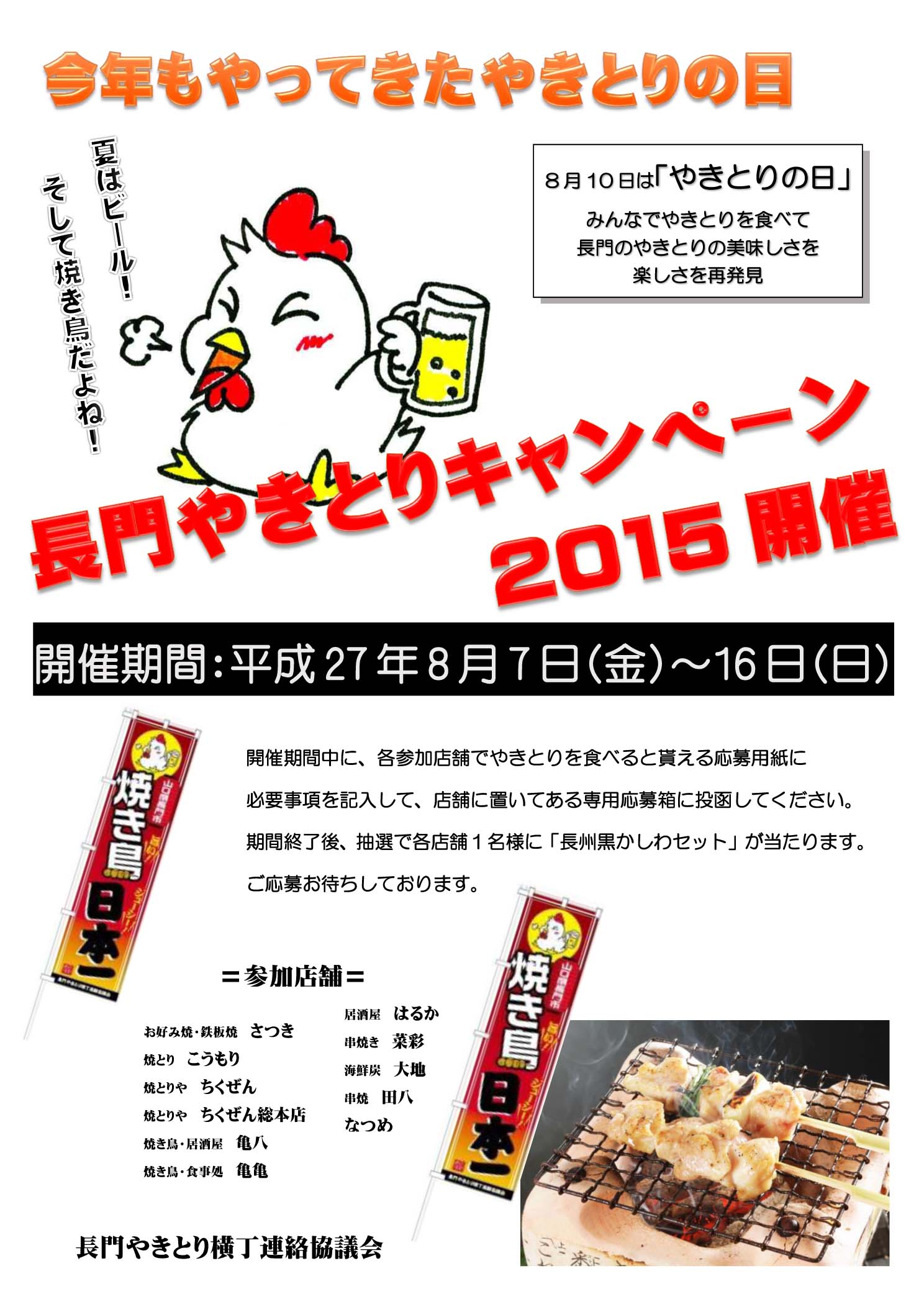 8월 10일은 「야키토리의 날」입니다! 그에 따라 "나가토 야키토리 캠페인 2015"가 나가토 야키토리 요코 쵸 연락 협의회의 주최에 의해 실시됩니다! 개최 기간 중에 참가 점포에서 야키토리를 먹으면 받을 수 있는 응모 용지에 필요 사항을 기입하고, 점포에 있는 전용 응모 상자에 투함해 주십시오. 추첨으로 각 점포 1명 에게 「조슈 흑 카시와 세트」가 맞습니다. 많은 응모를 기다리고 있습니다. ☆야키토리의 거리가가☆ 검은 카시와 사본【실시 기간】8월 7일(금)~16일(일) 【참가 점포】