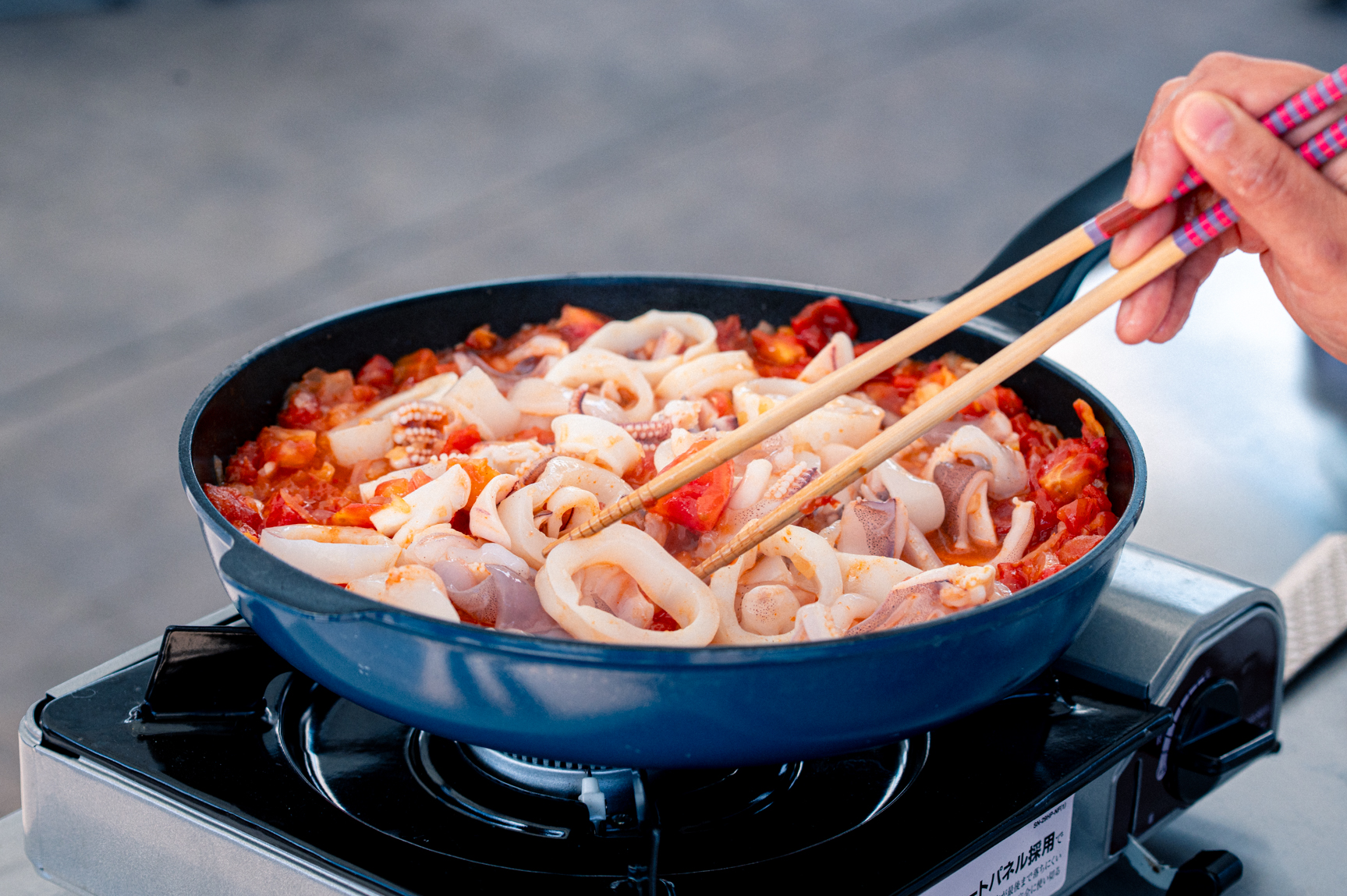 続いては志麻さんによる料理のデモンストレーション。毎年10〜12月にかけて旬を迎える仙崎漁港水揚げのケンサキイカ「仙崎ぶとイカ」をメイン食材に、「セート風イカの煮込み」を作ります。