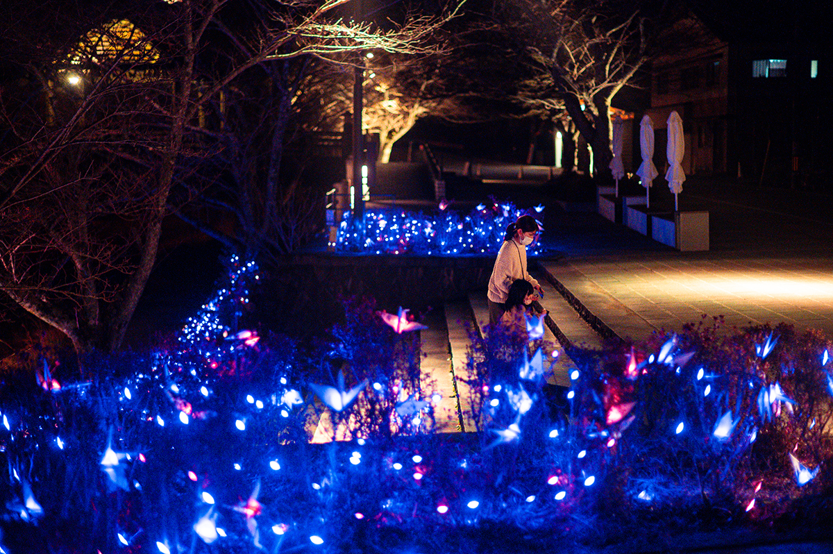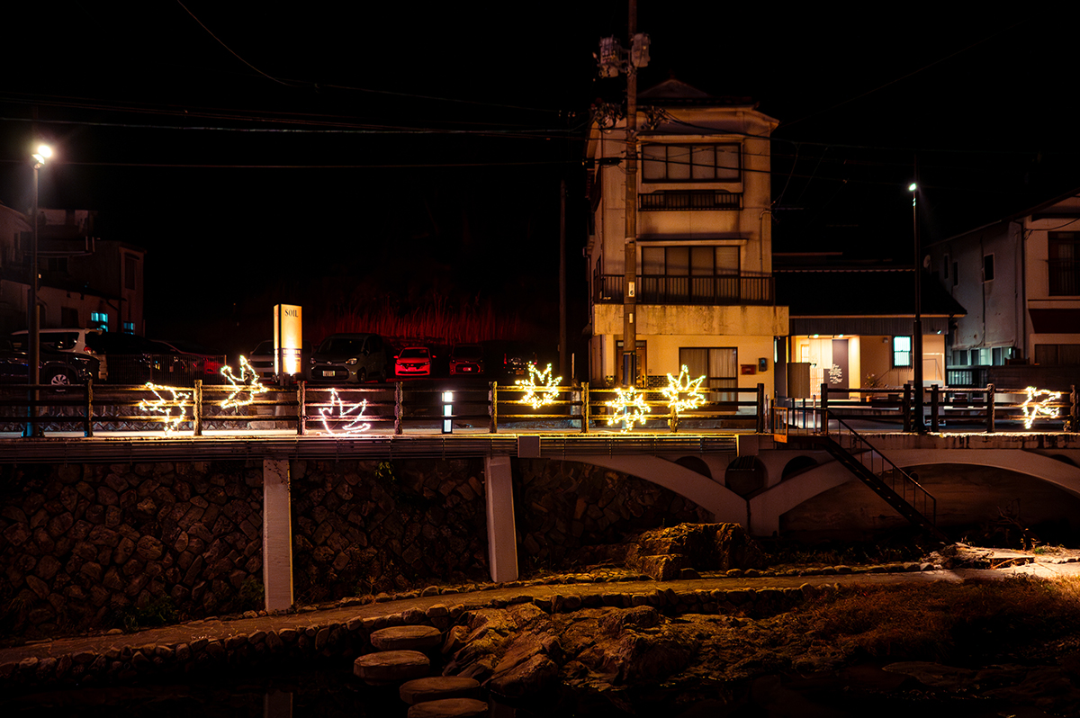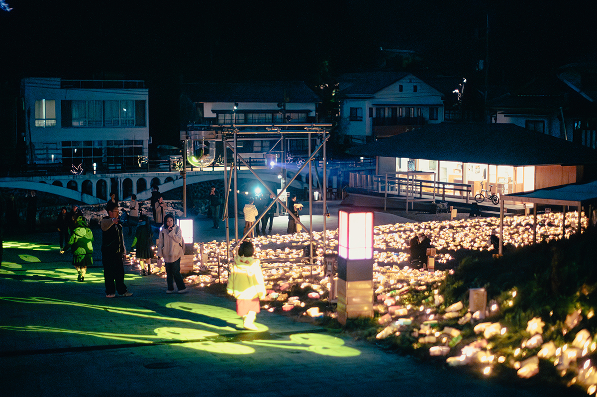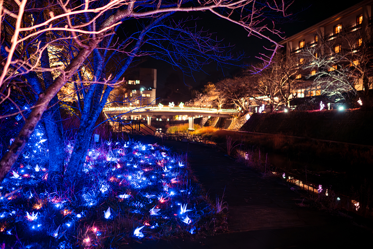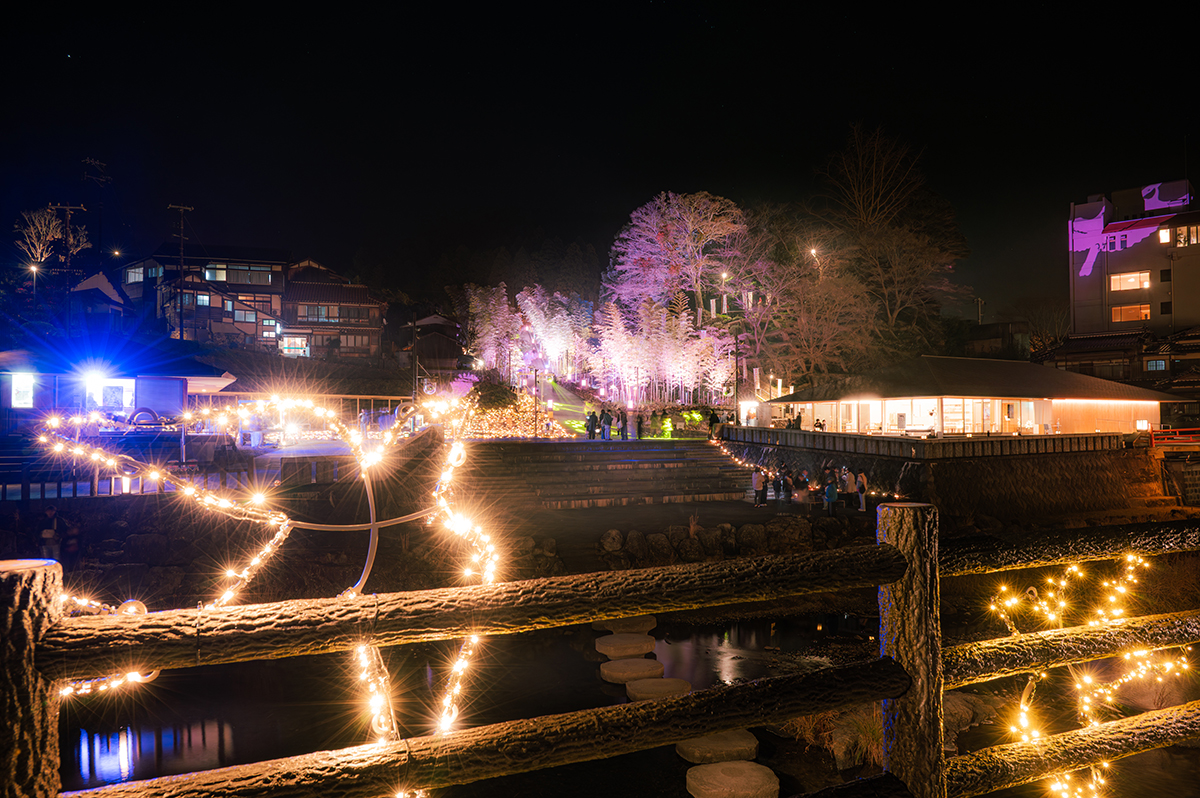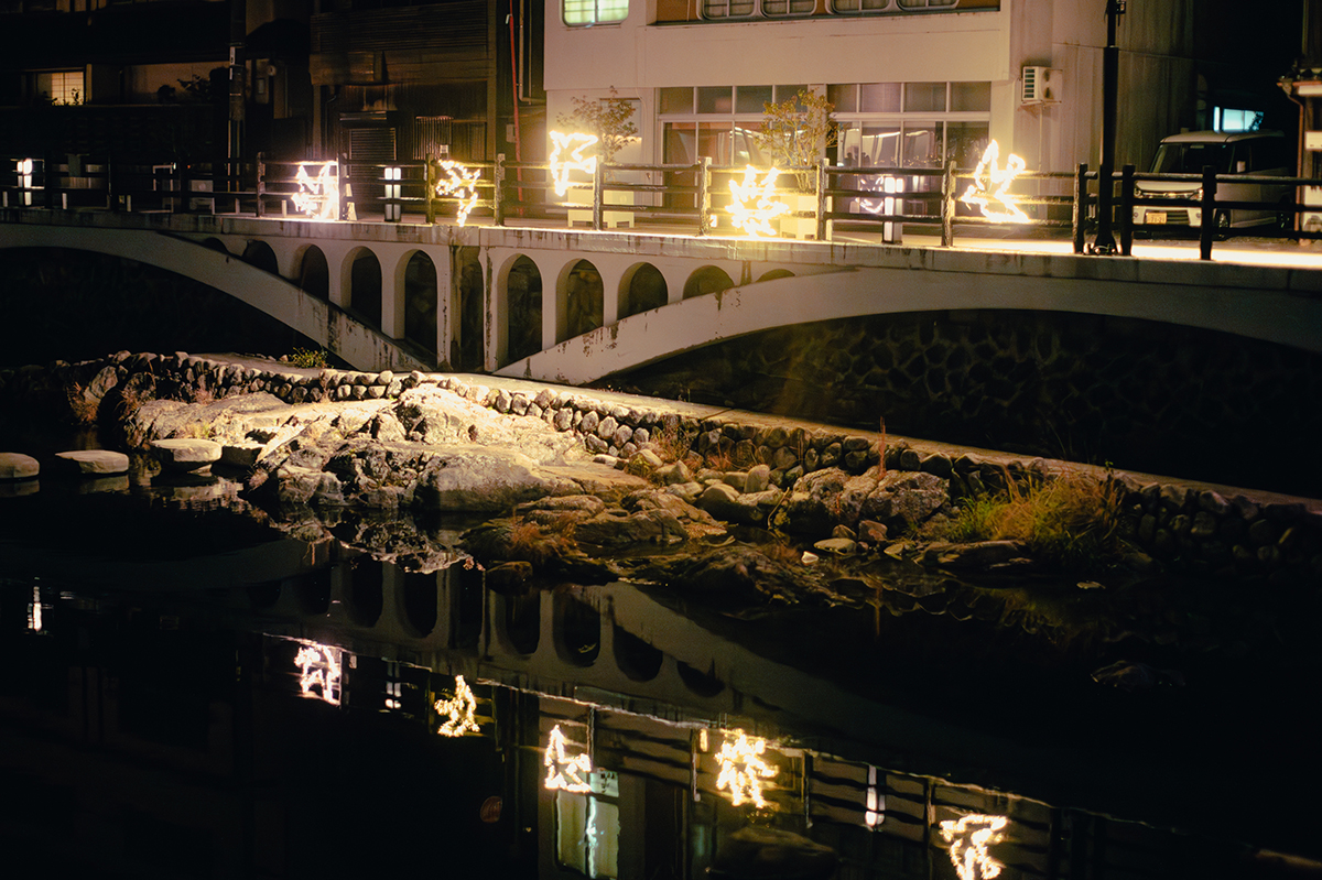 2018年からはじまった「音信川うたあかり」も今年で8回目。長門市出身の童謡詩人・金子みすゞの作品をテーマに、さまざまな演出の照明が温泉街を照らします。