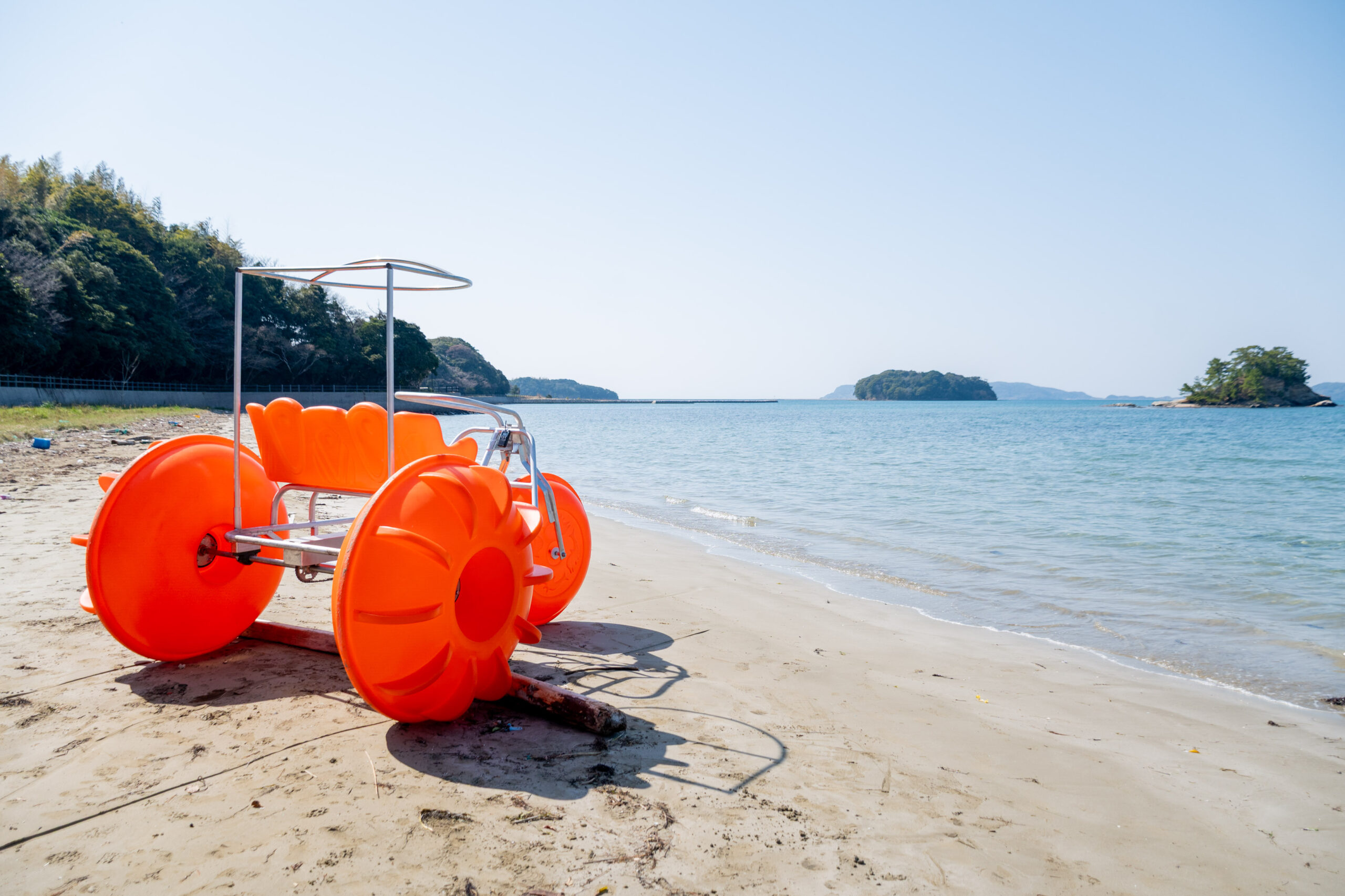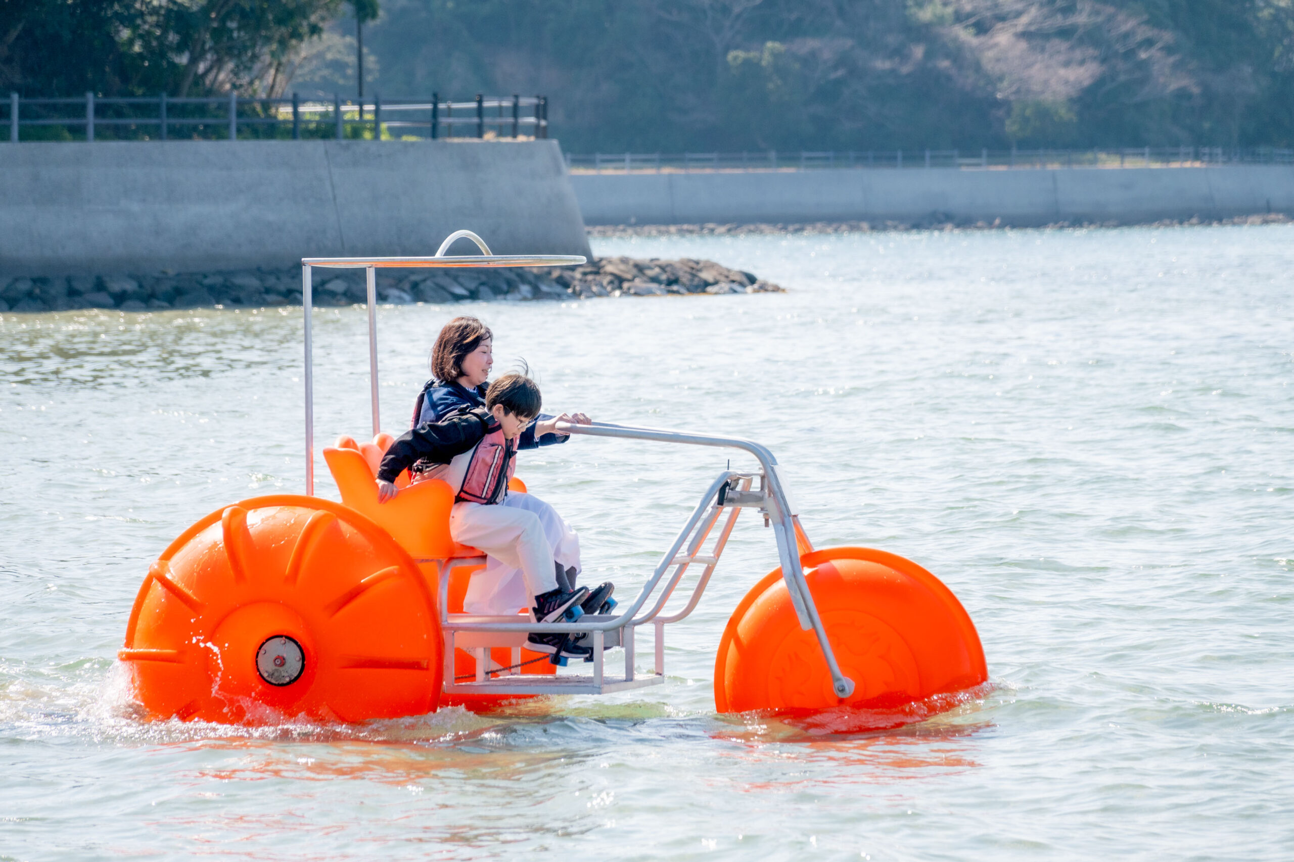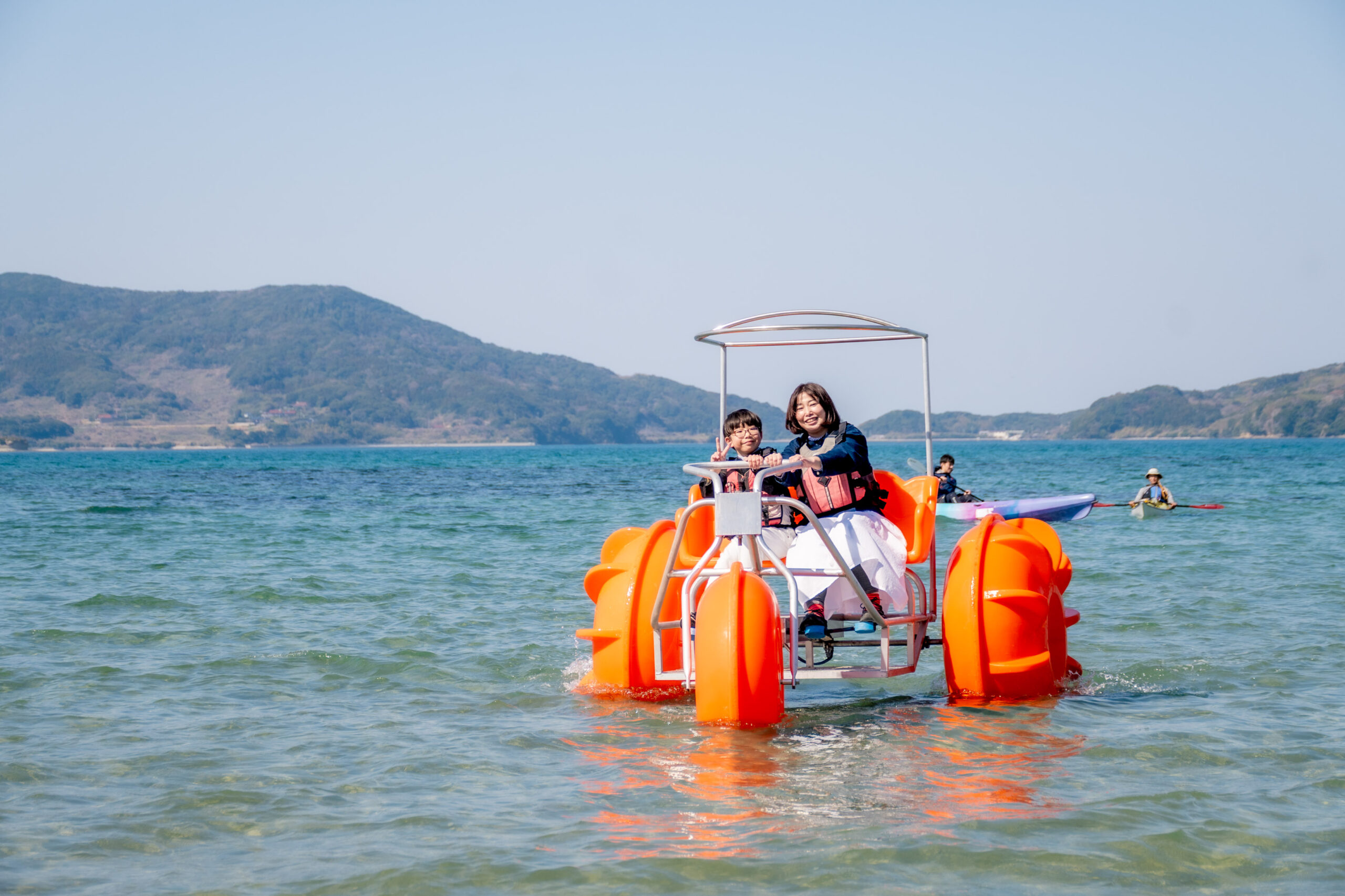 3月21日(土)、長門市・油谷いがみ海浜公園オートキャンプ場にて、海の上を自転車で走る新感覚アクティビティ「アクアサイクル」のお披露目会が開催されました。