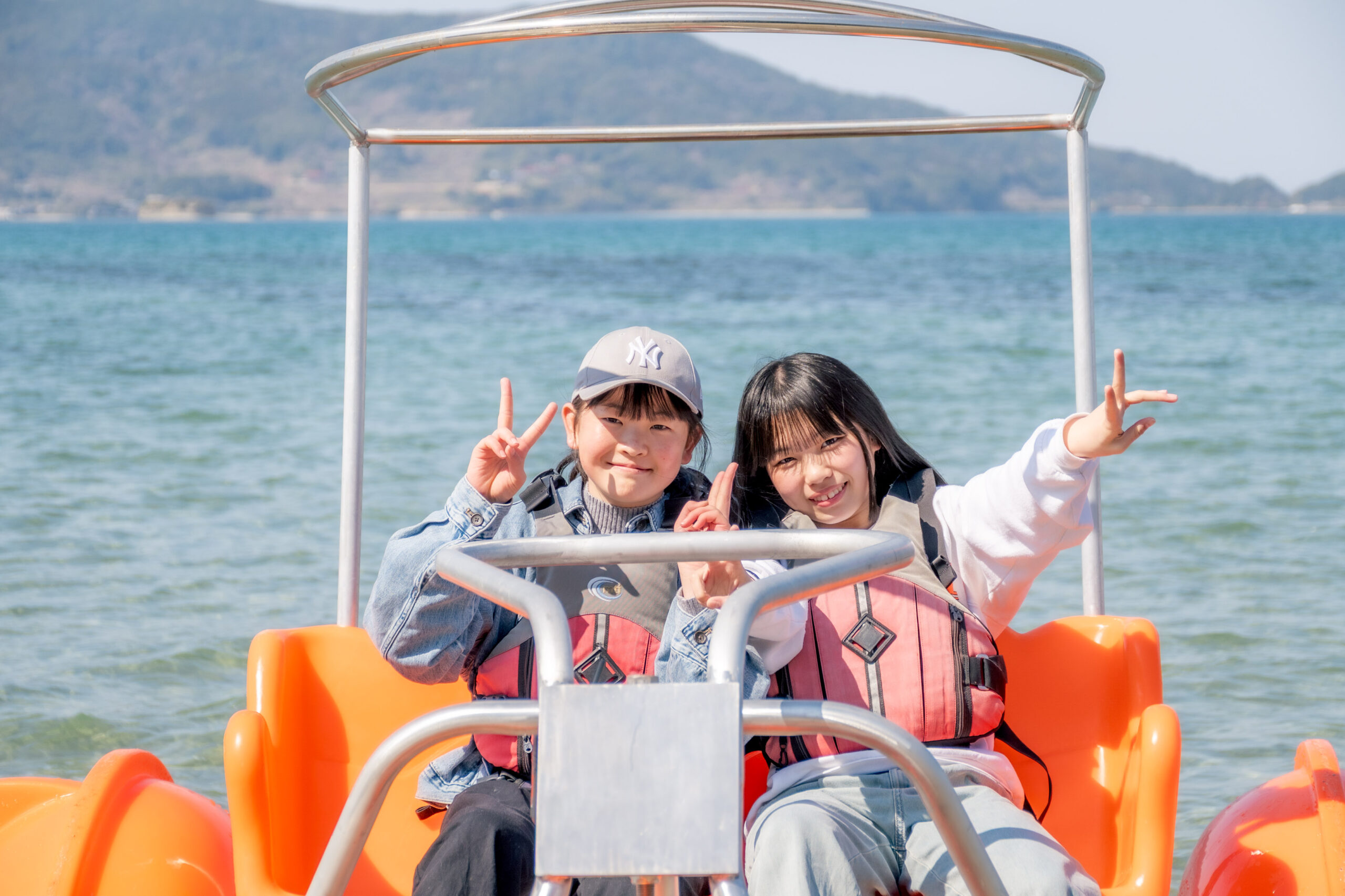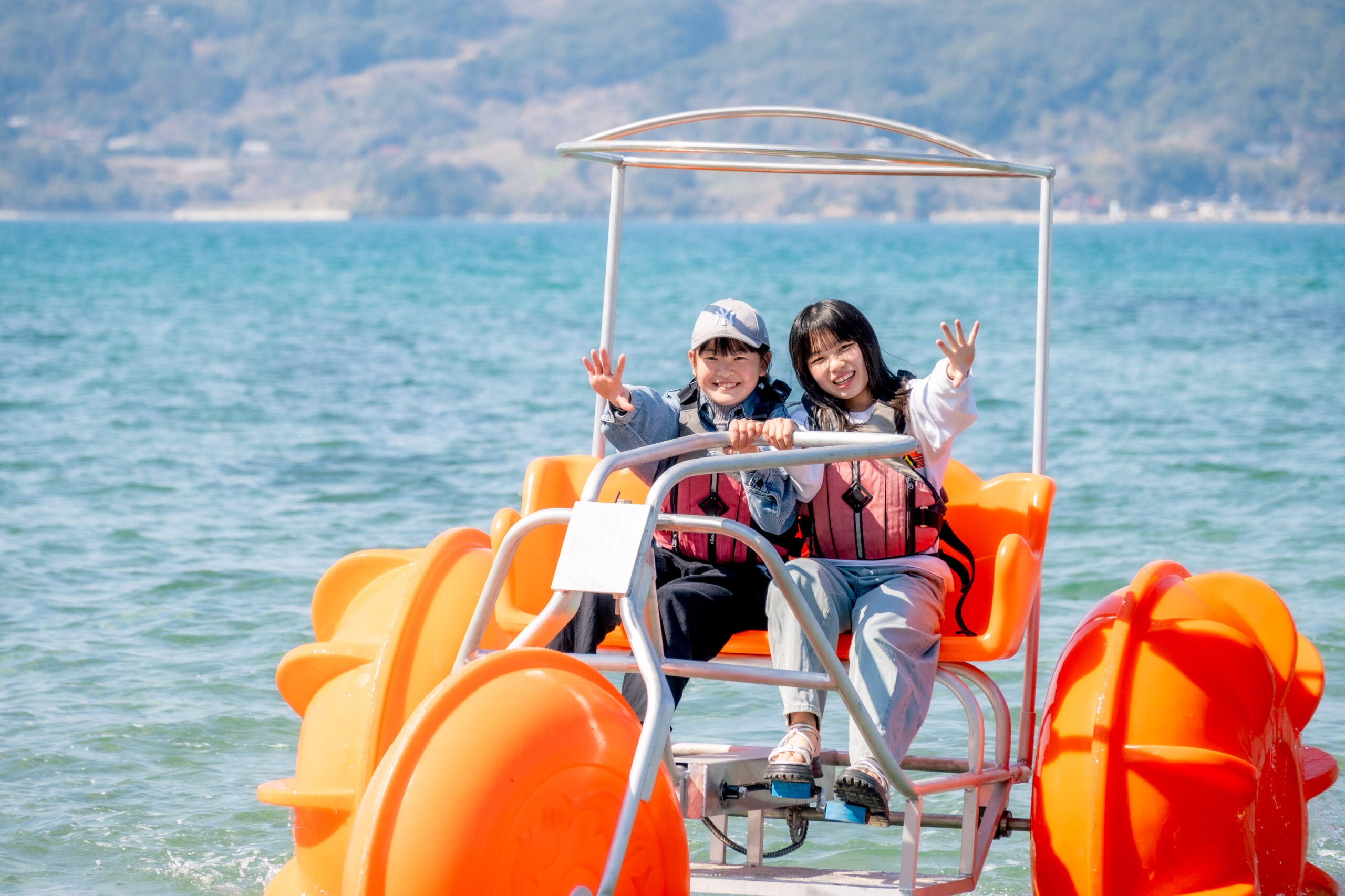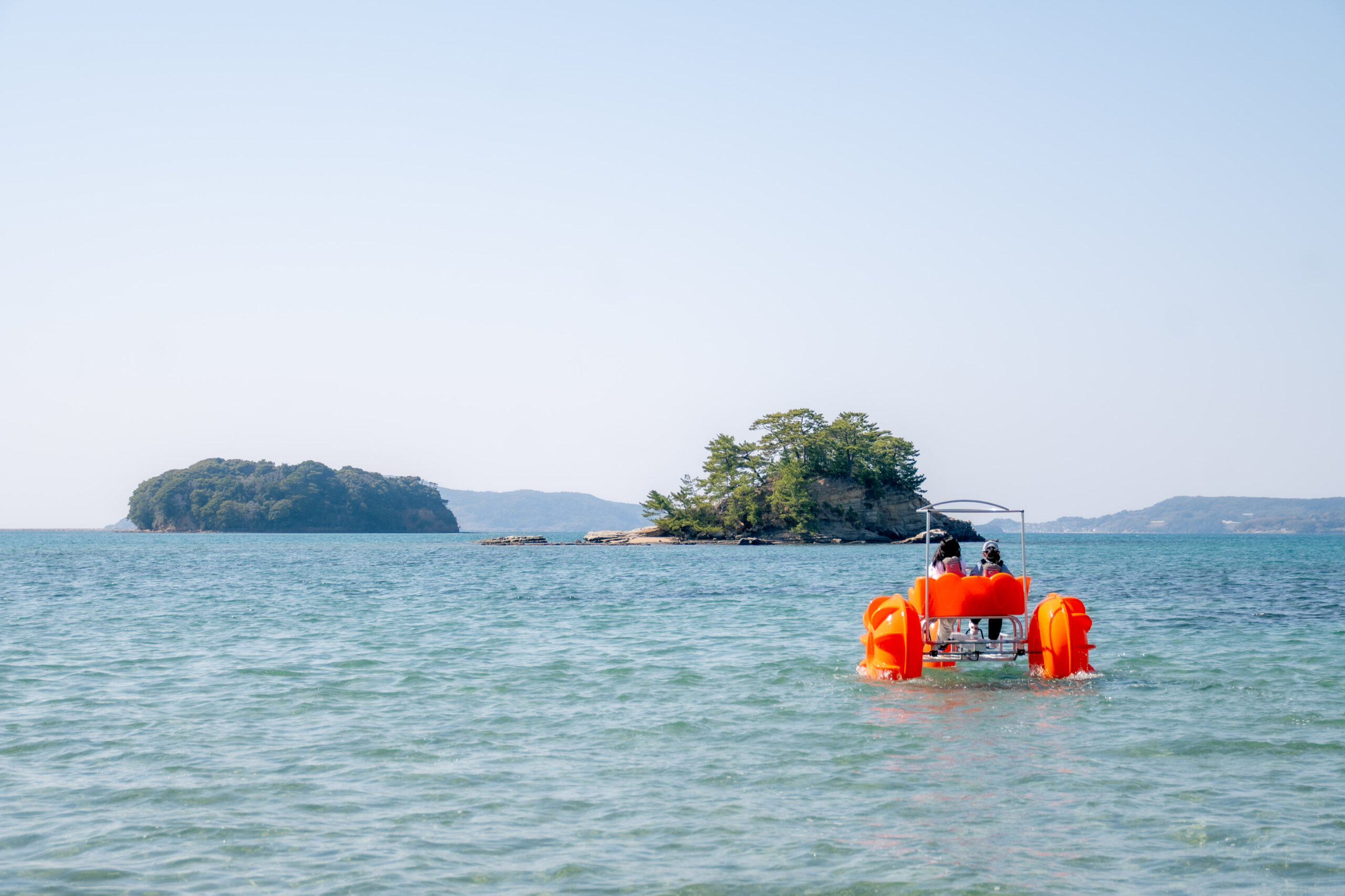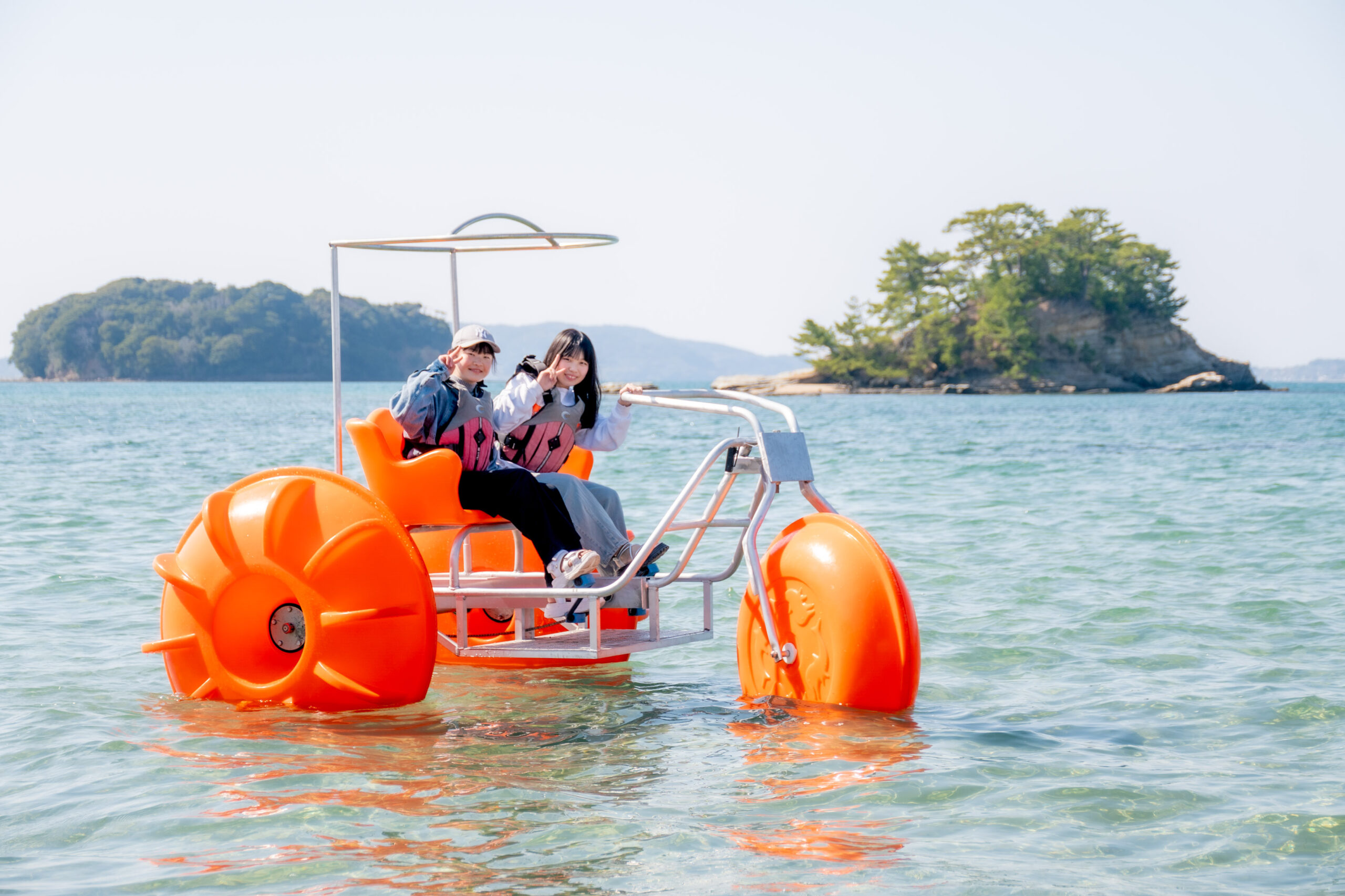 「アクアサイクル」は、大型のフロート(浮き)による高い安定性が特徴の2人乗り水上自転車。特別な免許や技術は必要なく、ライフジャケットを着用しペダルを漕ぐだけで、誰でも気軽に海上サイクリングを楽しむことができます。