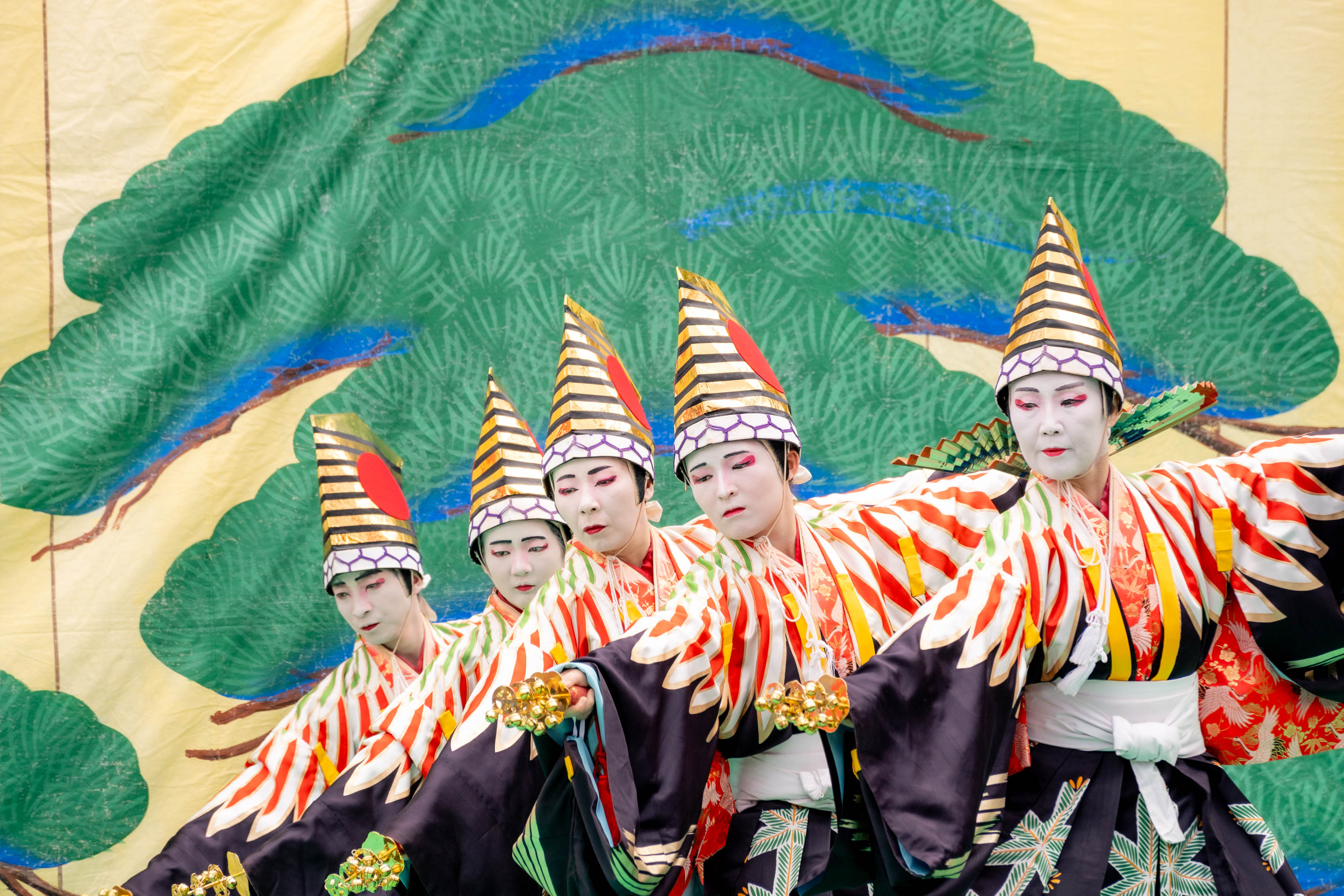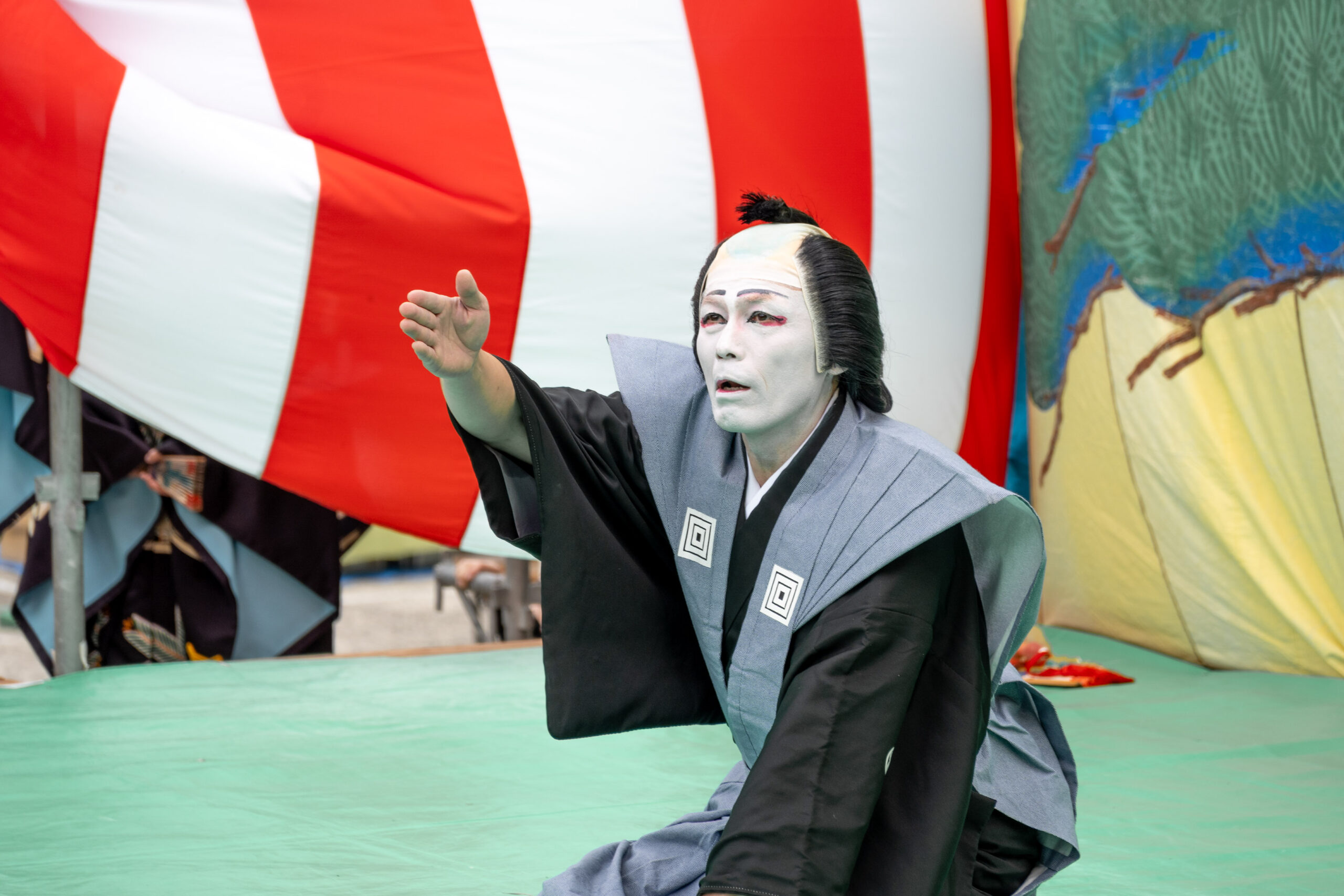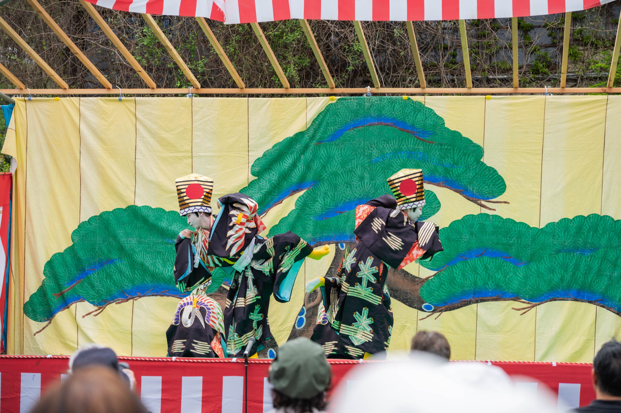 お祭りは、俵山KABUKI倶楽部による奉納からはじまります。天下泰平や五穀豊穣を祈願する「寿式五人三番叟(ことぶきごにんさんばそう)」が披露されました。