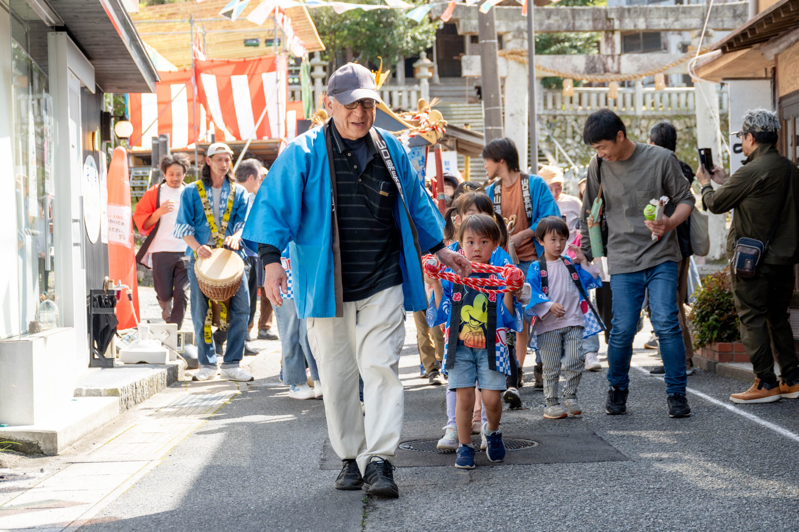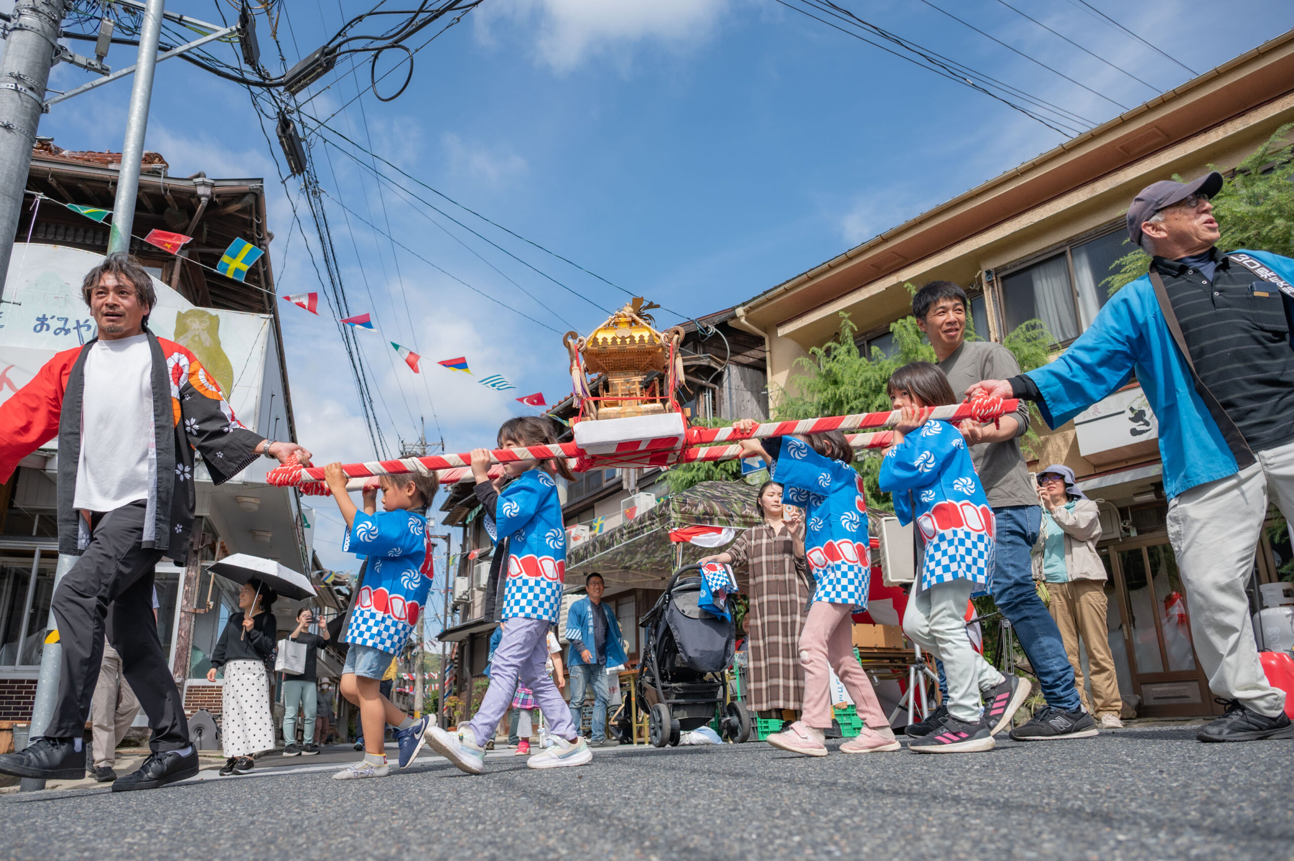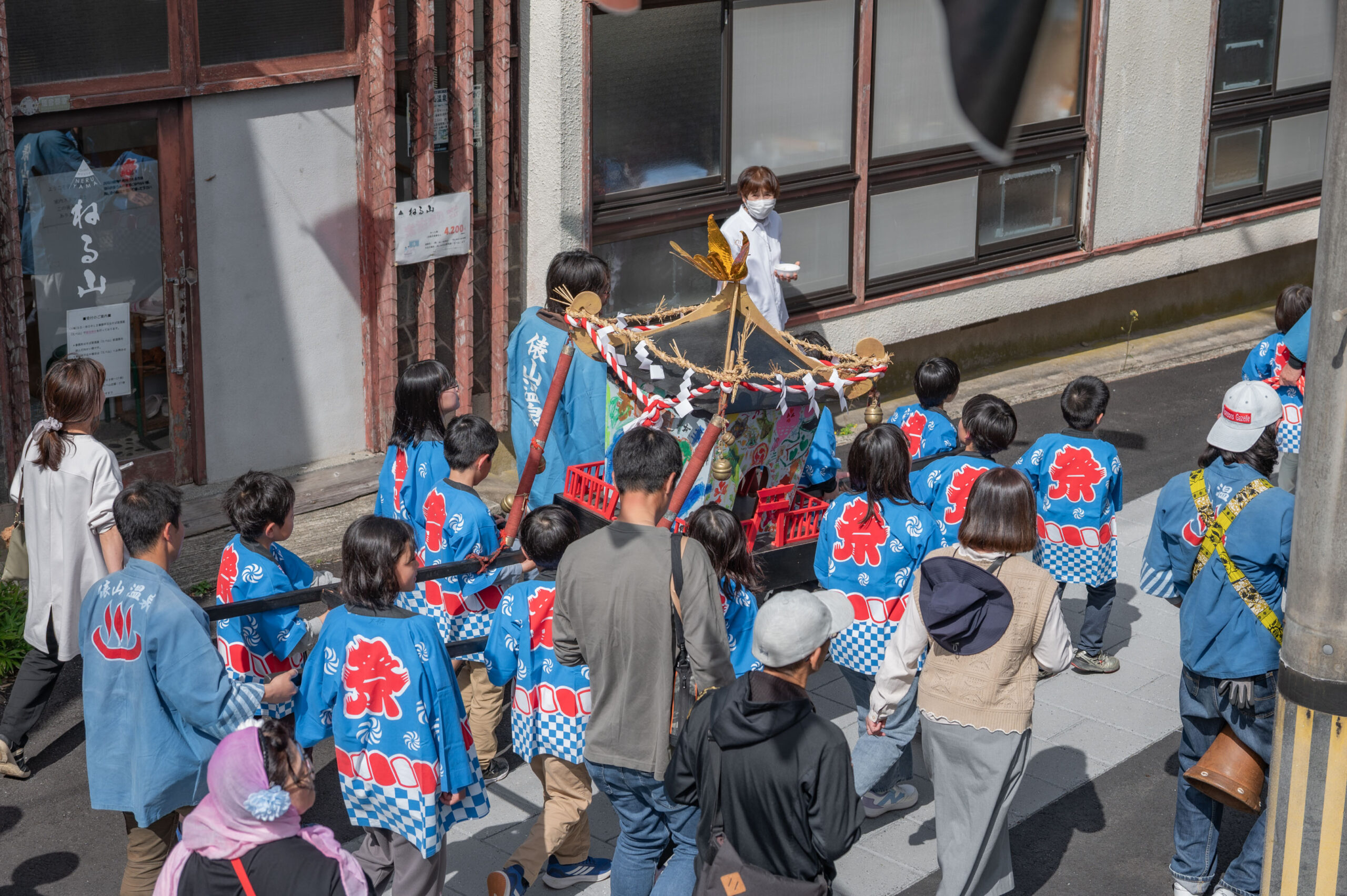地元の子供達がお神輿を担いで街を練り歩きます。大きく「わっしょい」と声を響かせながら、楽しそうな子供達の笑顔が溢れていました。