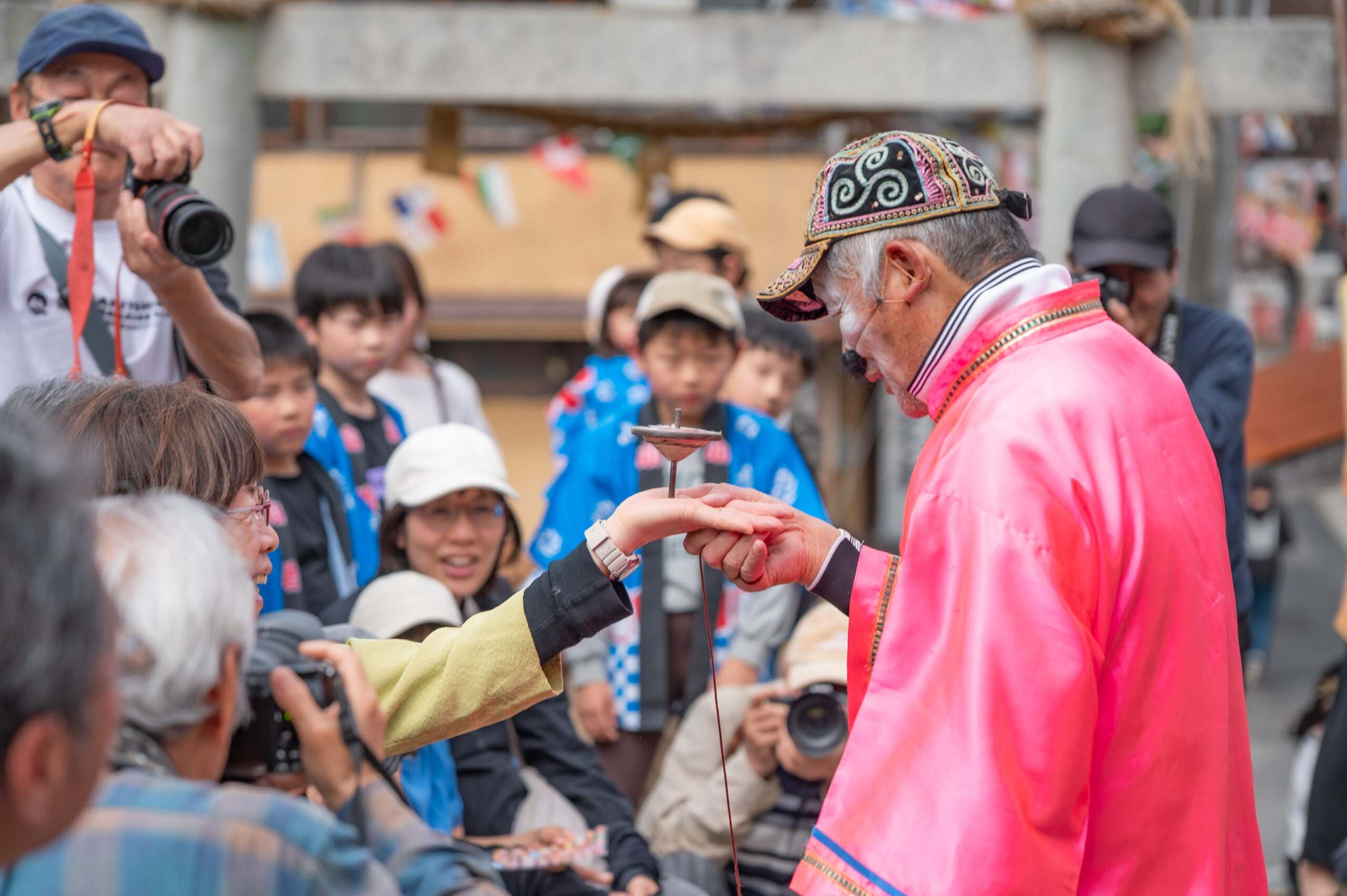 チンドンの芸披露には子供たちが興味津々に集まり、歓声や笑いに包まれました。