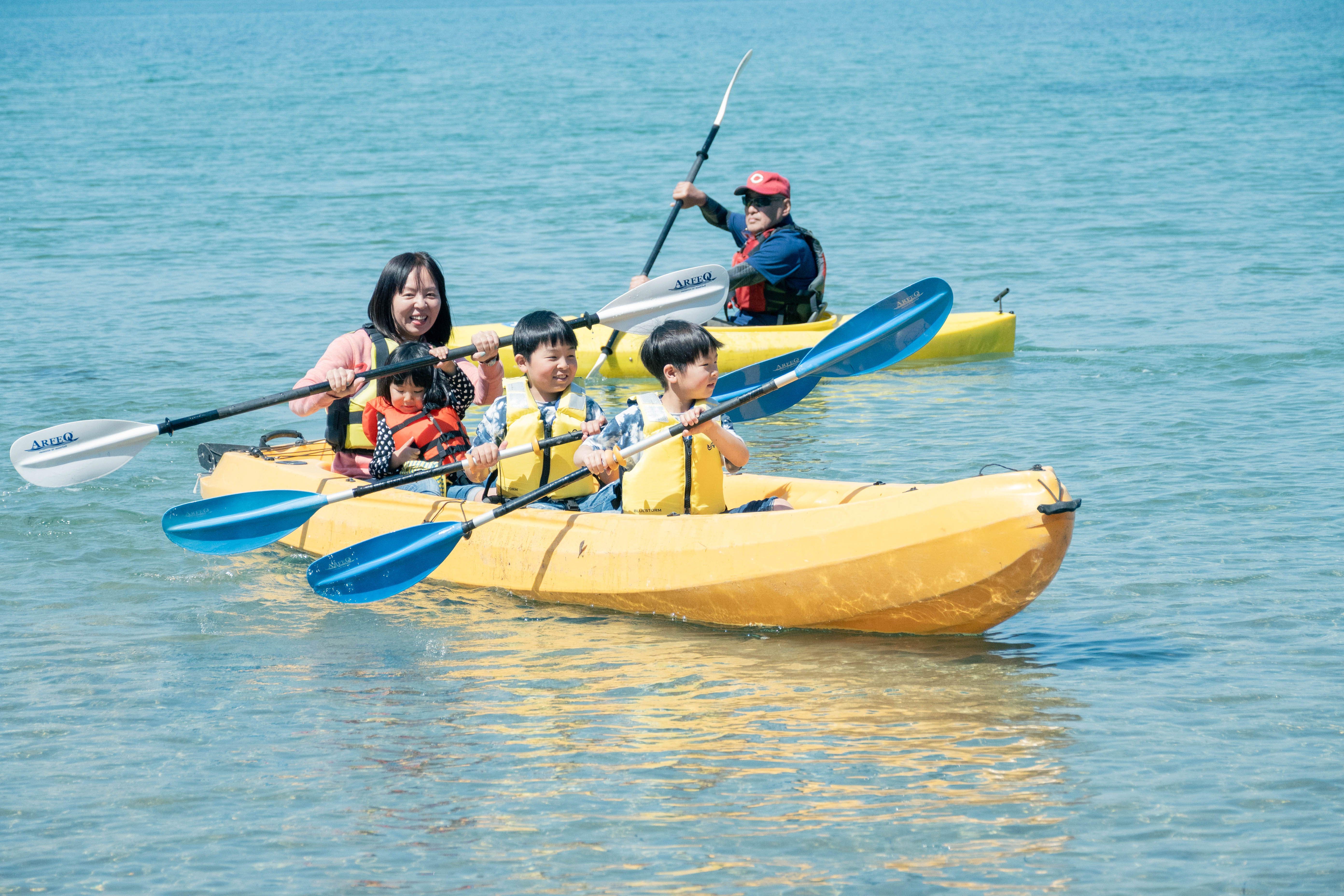 講師にシーカヤックの漕ぎ方のレクチャーを受けて海へ。参加者は長門市油谷の海を堪能されていました。