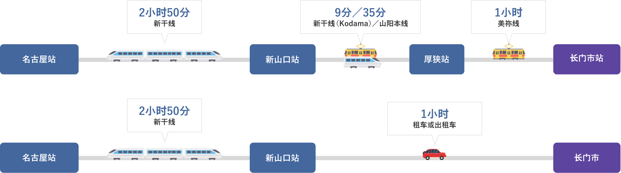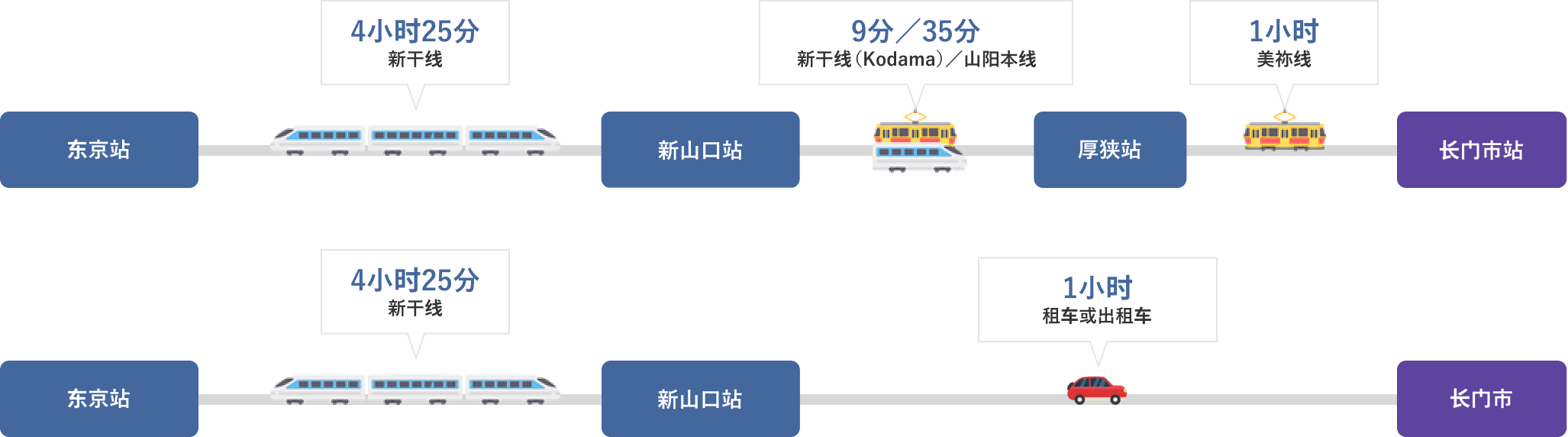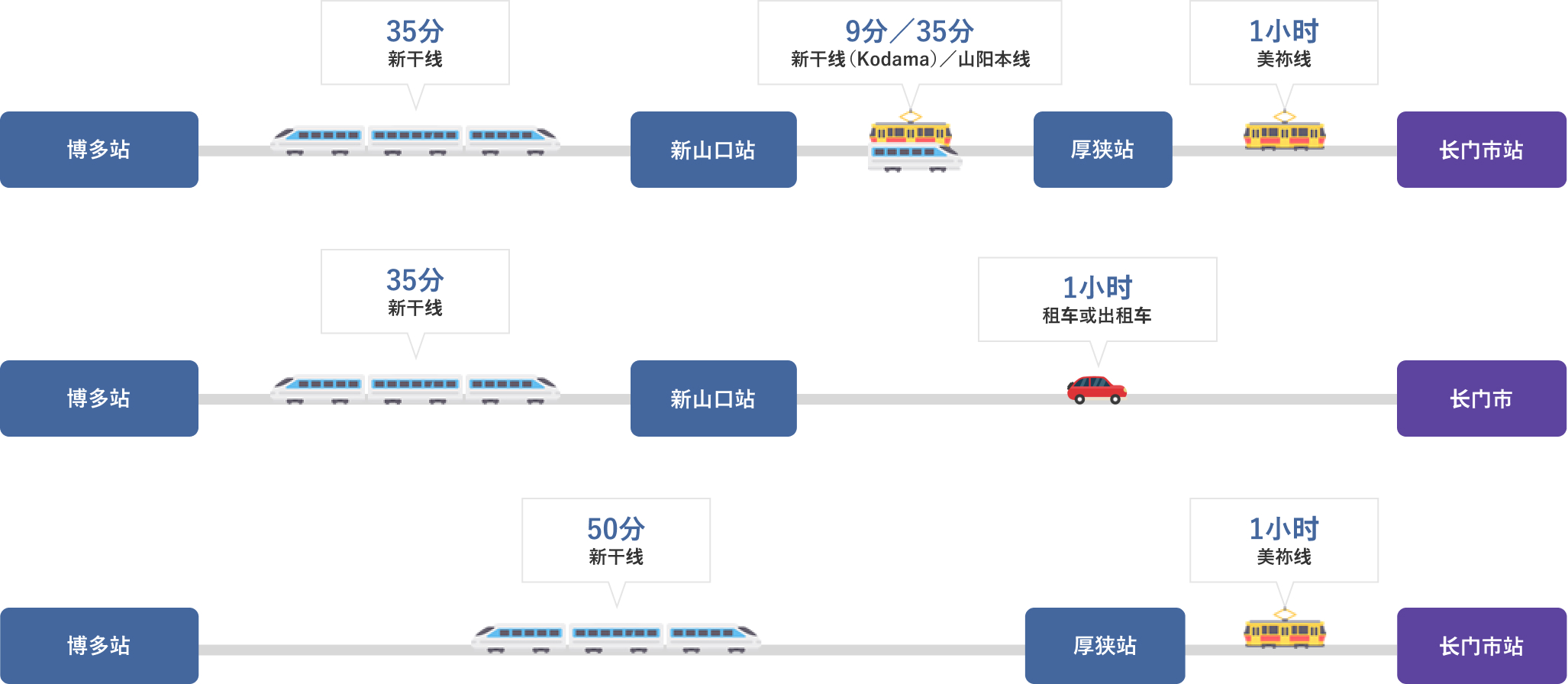 JR 新山口站和长门市(长门汤本温泉、长门市站和 Senza Kitchen 路站)之间有直达巴士。