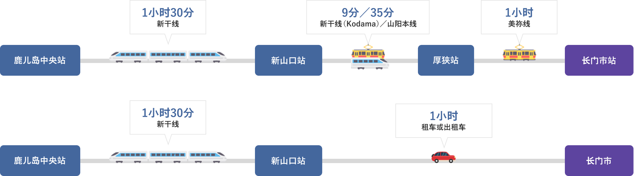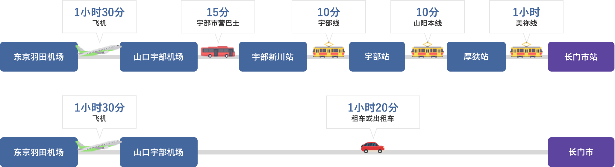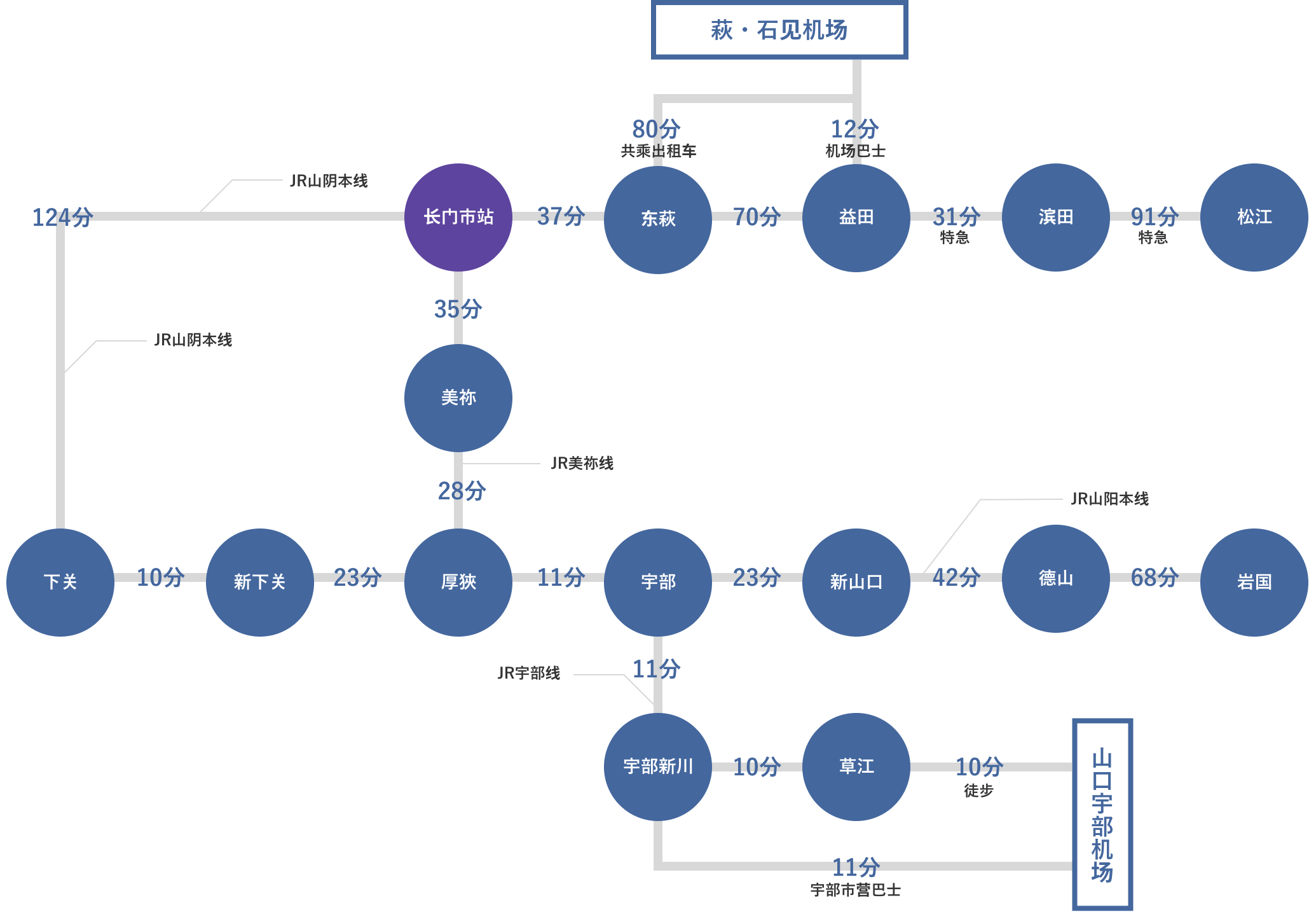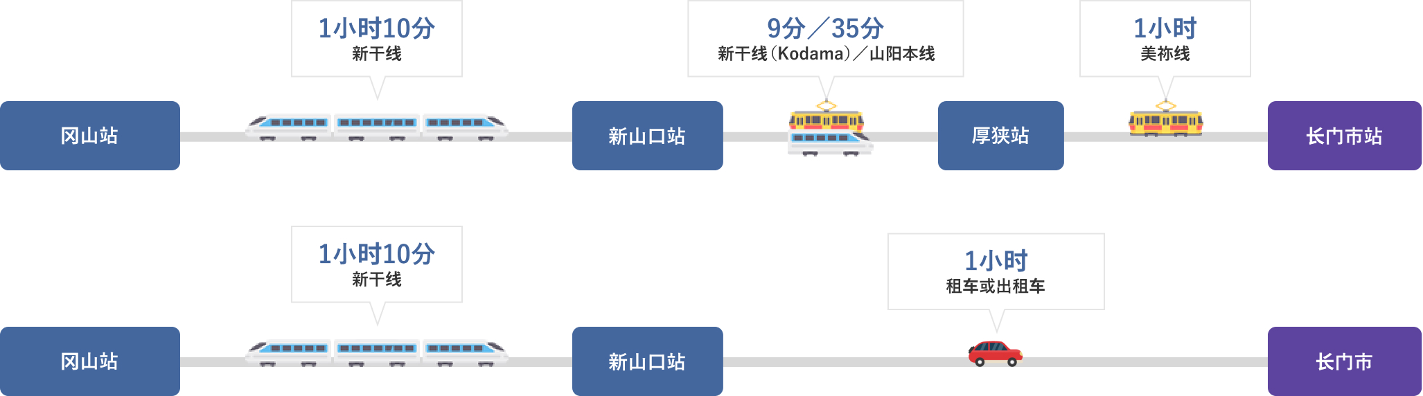 JR 新山口站和长门市(长门汤本温泉、长门市站和 Senza Kitchen 路站)之间有直达巴士。